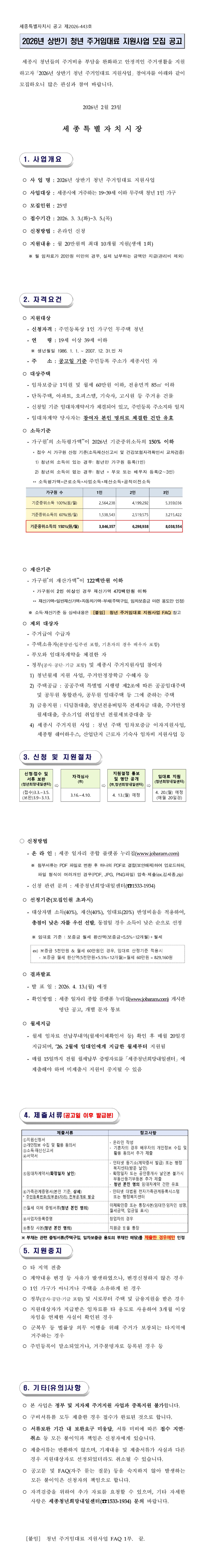 2026년 상반기 청년 주거임대료 지원사업 모집 공고 모집기간 2026.03.03. - 2026.03.05. 모집전 서비스 구분 정착지원 지원대상 청년 기관명 세종일자리경제진흥원 기관 주소 세종시 보듬6로 20 담당자 연락처 1533-1934 담당자 이메일 dayo@sjepa.or.kr 지원방법 지원신청 이동하기 ※ 주의사항: [붙임1]의 양식을 다운 받아 작성하신 후, 구비서류와 함께 하나의 PDF 파일로 병합하시거나, 압축(ZIP)하여 한개의 파일로 업로드 하여 주시기 바랍니다. 목록