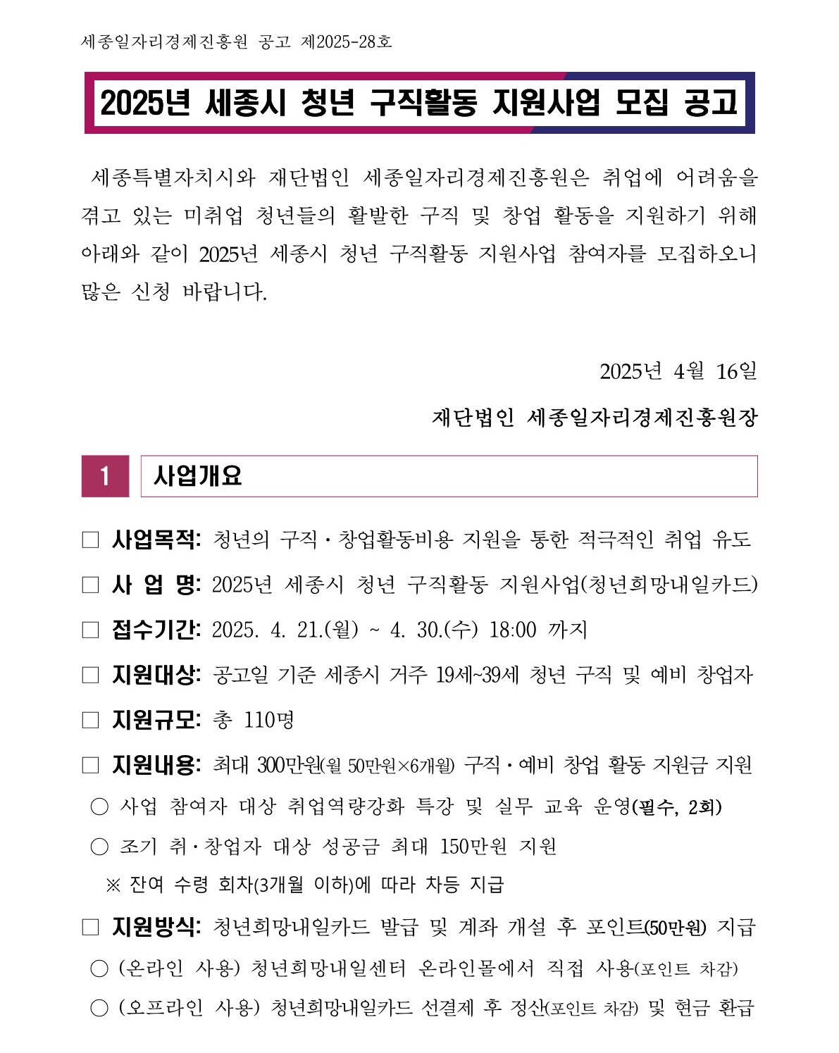 2025년 세종시 청년 구직활동 지원사업 모집 공고(마감)