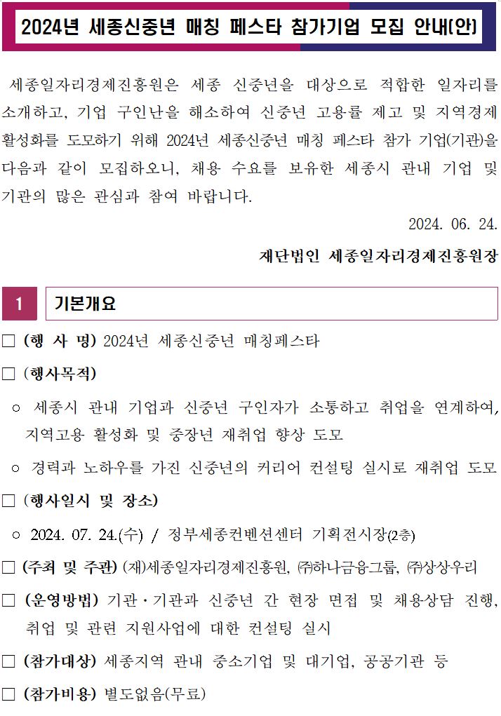 2024년 세종신중년 매칭 페스타 참가 기업(기관)을 다음과 같이 모집하오니, 채용 수요를 보유한 세종시 관내 기업 및 기관의 많은 관심과 참여 바랍니다.