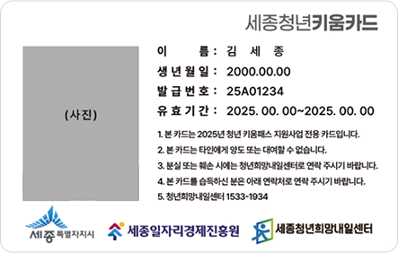 ※ 세종특별자치시 보듬6로 20 사회적경제공동체센터 1층(청년희망내일센터 사무실) 내방 후 카드 수령