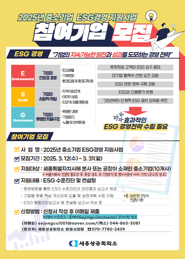 2025년 중소기업 ESG경영 지원사업 참여기업 모집 공고 모집기간 2025.03.12. - 2025.03.31. 모집마감 서비스 구분 기업지원 지원대상 기타 기관명 세종상공회의소 기관 주소 세종특별자치시 한누리대로 2003 담당자 연락처 070-7780-2439 담당자 이메일 sejongcci001@naver.com 지원방법 온라인 신청 지원신청 이동하기 목록