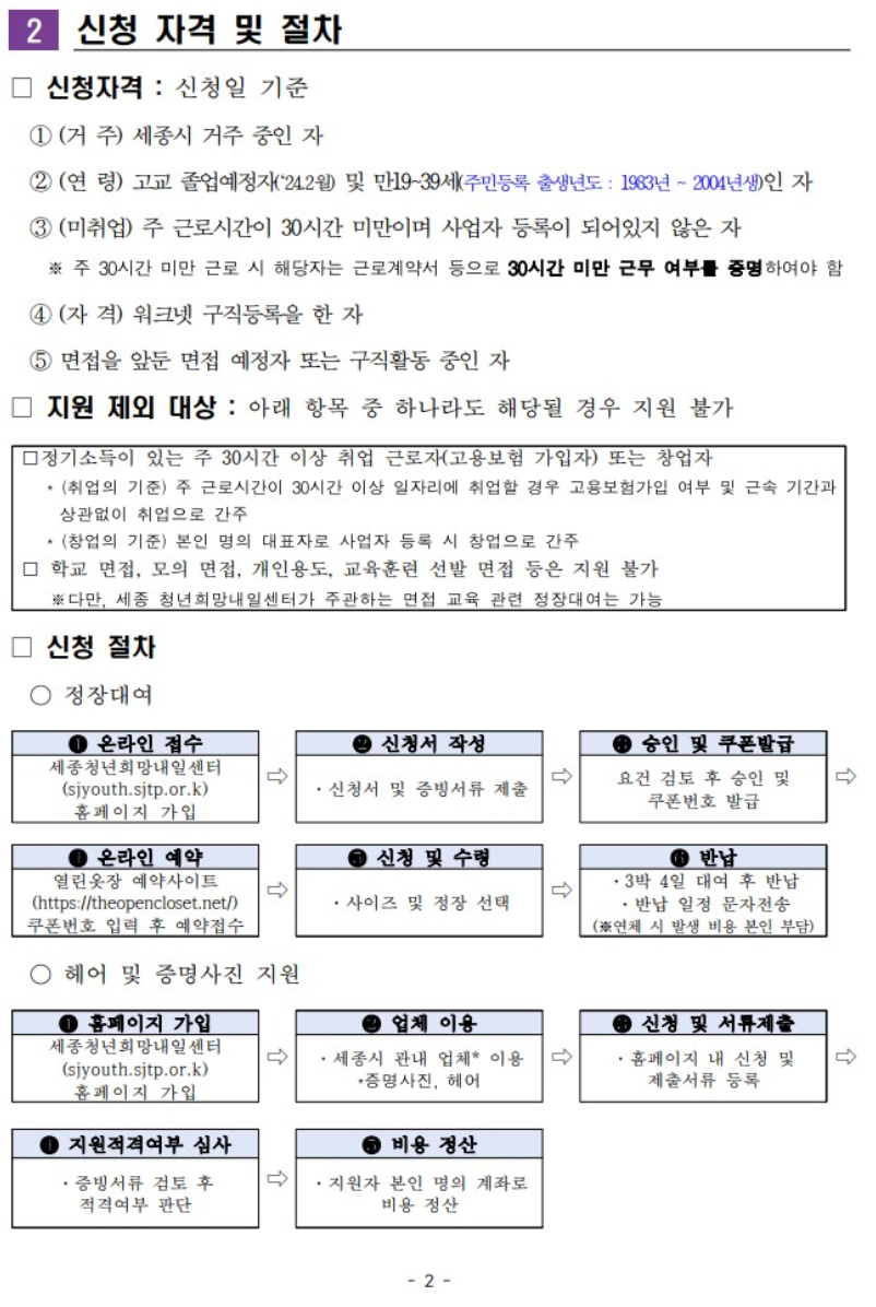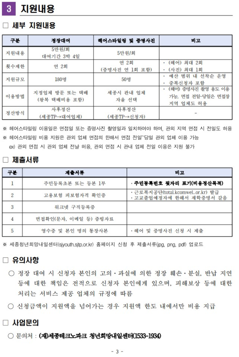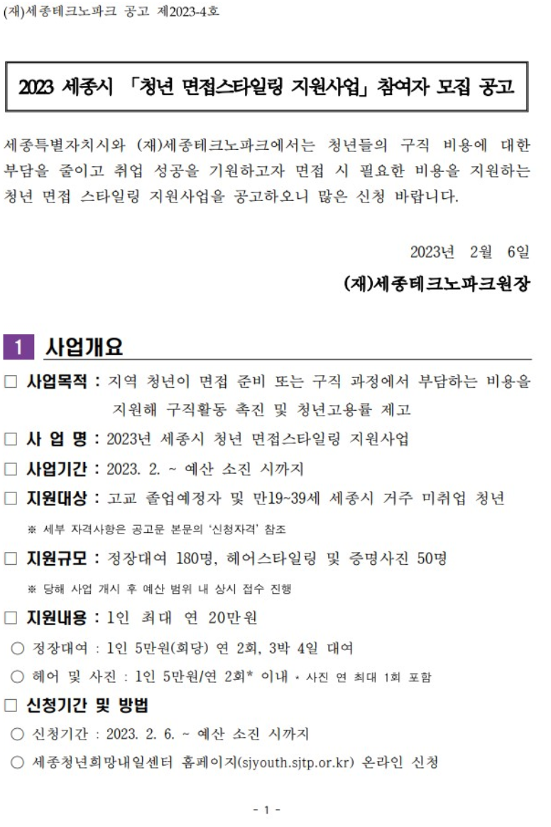 2023년 세종시 청년 면접 스타일링 지원사업 모집기간 2023.02.15. - 2023.12.31. 모집마감 서비스 구분 기타 지원대상 청년 기관명 세종청년희망내일센터 기관 주소 세종특별자치시 다정중앙로 20 담당자 연락처 044-850-3825 담당자 이메일 anna20@sjepa.or.kr 지원방법 온라인 신청 지원신청 이동하기 목록